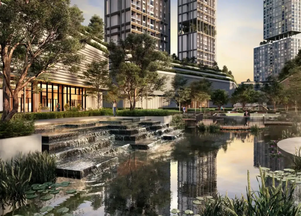 A calm, modern mini township with a park and cozy retail spaces.